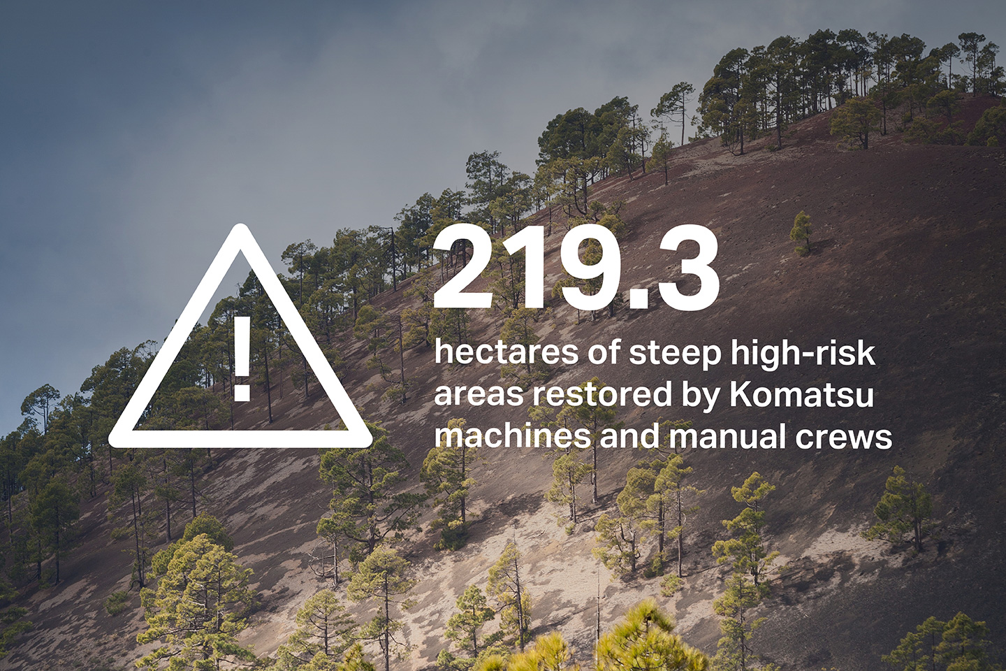 Skogtjenestene på øya tok i bruk Komatsu sin hogstmaskin og lastbærer for å fjerne farlige trær fra bratte, brannskadde skråninger i vernede områder.