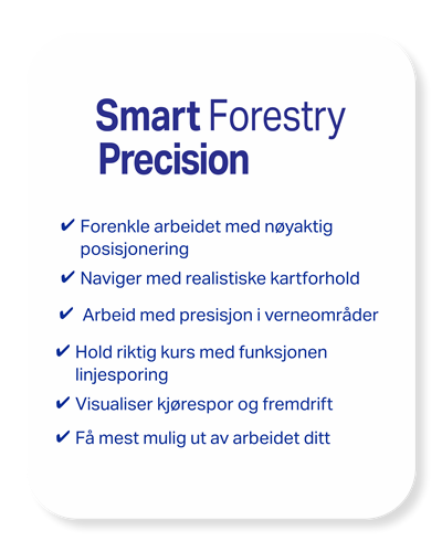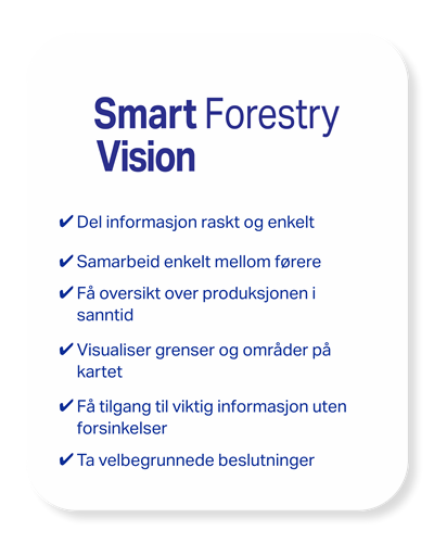 Med Smart Forestry får du tilgang til en samling med digitale tjenester som hjelper deg med å gjøre arbeidsplassen trygg, smart, produktiv og bærekraftig – Uansett om du har en eller hundre skogsmaskiner. Du har kontroll på maskinene, kan samarbeide med kollegaer og ta gode avgjørelser basert på fakta.